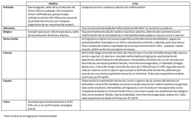 Resumen de los datos de los 3.511 focos notificados en el norte de Europa entre el 14 de diciembre de 2011 y el 13 de agosto de 2012. Por cada casilla de “especie-país” se muestra el número total de casos, el número total de susceptibles y el porcentaje de morbilidad aparente. El total de susceptibles para todos los países (*) se ha obtenido sin poder incluir los de Holanda, ya que no se notifica el número de susceptibles por brote, por lo que los valores de morbilidad aparente generales están ligeramente aumentados. (Fuente: elaboración propia con datos de WAHID-OIE hasta el 14 de agosto de 2012). A continuación de la tabla se muestran las distintas definiciones de caso según cada país (Fuente: traducción propia del informe técnico de la EFSA: ‘"Schmallenberg" virus: likely epidemiological scenarios and data needs’; para España, “extraído del Programa Nacional de Vigilancia Epidemiológica frente al Virus de Schmallenberg, año 2012”).